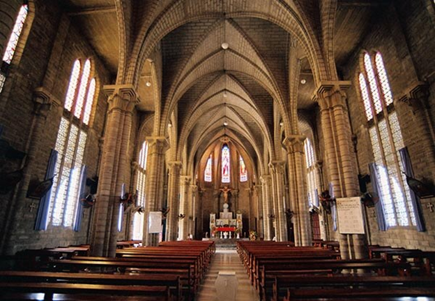 The cathedral features stunning Gothic-style architecture, including granite stone walls and stained-glass windows imported from France.